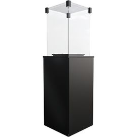 Im Brennbereich schützt temperaturbeständiges Glas vor dem direkten Kontakt mit dem Feuer. Der Heizstrahler wird mit Flüssiggas aus einer im Gehäuse versteckten Flasche betrieben. Das Einschalten dauert nur wenige Sekunden.